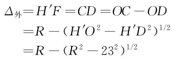 HJC40型焊接检验尺主尺端面AB与套筒外侧表面相切,保证主尺中心线对准圆心,以此为基准,在高度尺的配合下进行测量,读出的测量值会小于实际值,其差值为Δ外,套筒外侧纵向焊缝余高测量示意如图6所示。